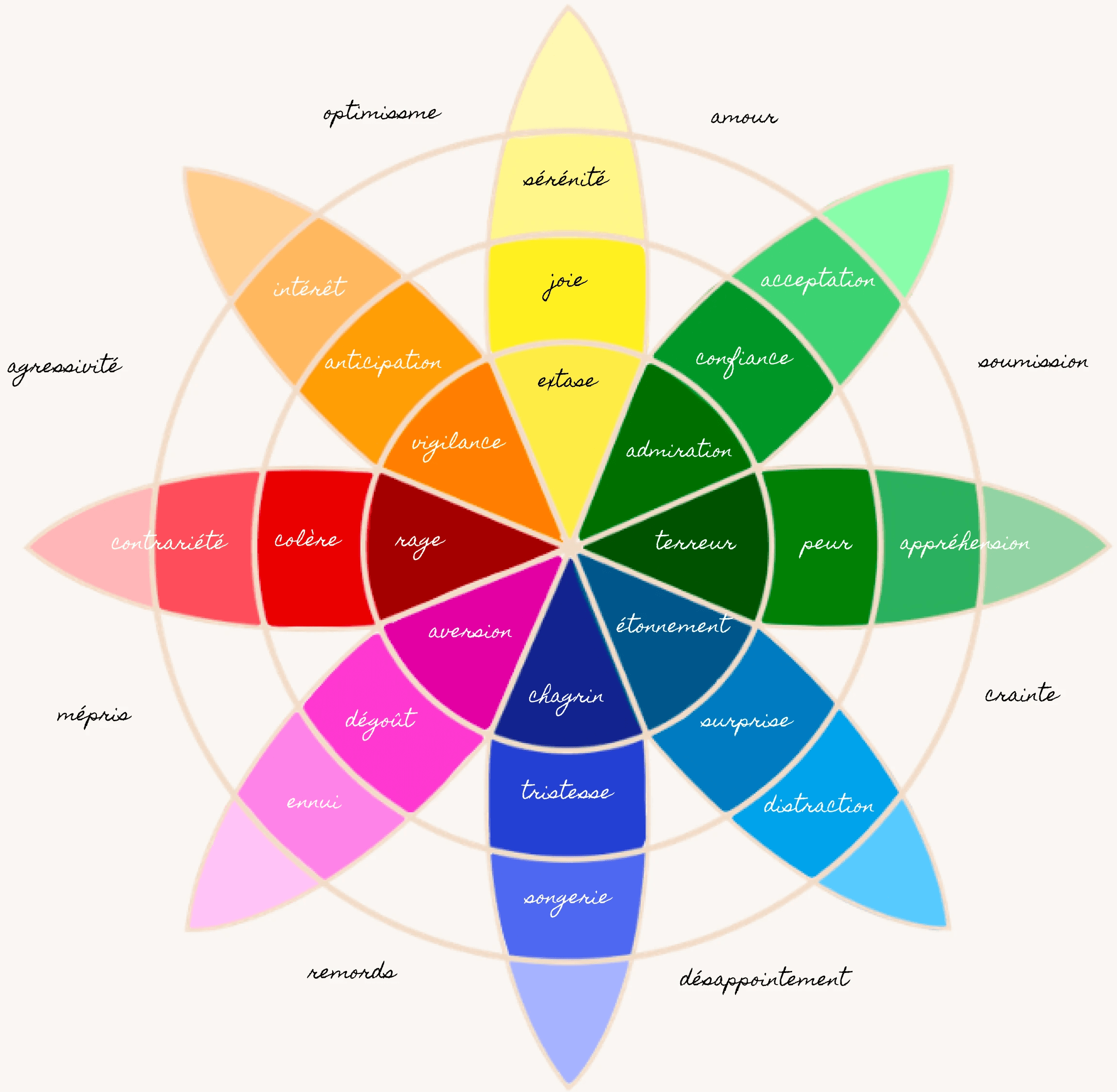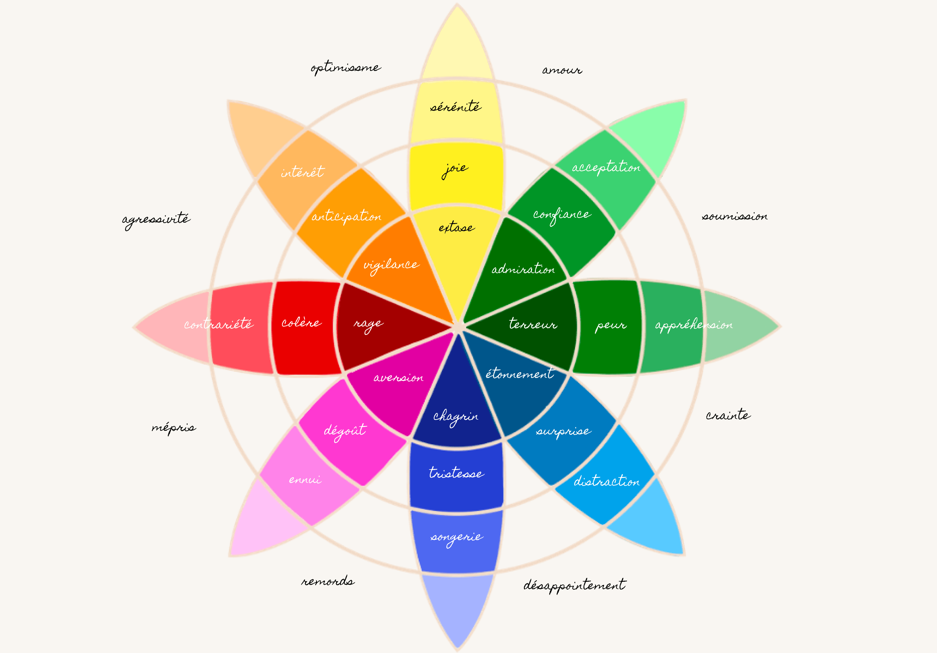 Cette roue des émotions inventée par Robert Plutchik établit un modèle des émotions humaines et de leurs relations possibles.